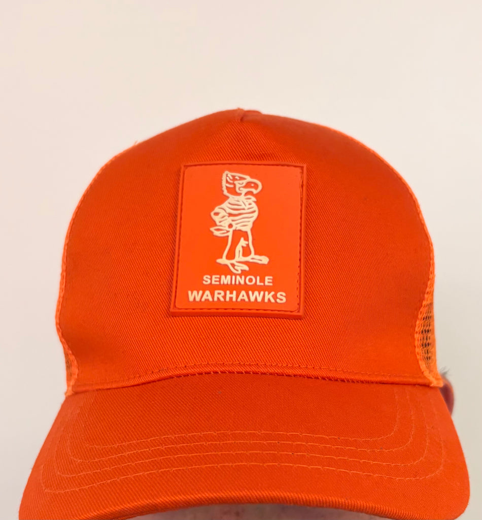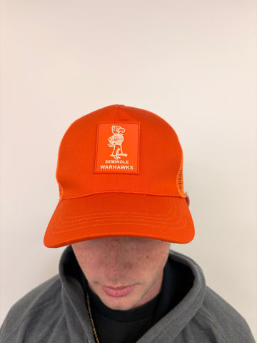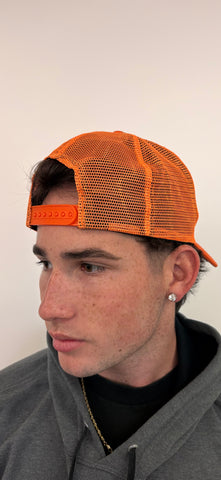 Orange Wally Trucker hat with a rubber Wally patch in the front, inspired by Coach Walker.