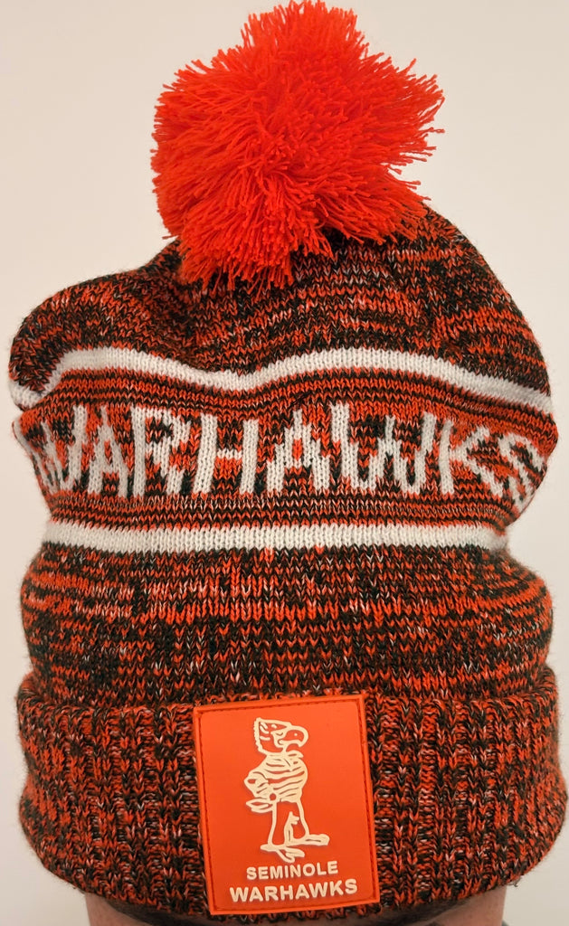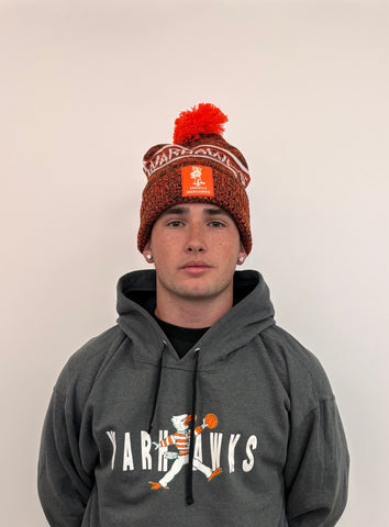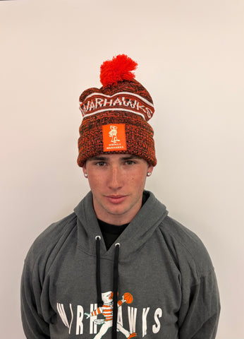 An orange and green beanie with an orange pom pom. Inspired by Coach Walker